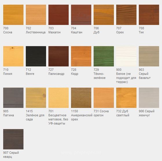 700 Сосна; 702 Лиственница; 703 Махагон; 704 Каштан; 706 Дуб; 707 Орех; 708 Тик; 710 Пиния; 712 Венге; 727 Палисандр; 728 Кедр; 729 Тёмно-зелёное; 900 Белое (не подходит для террас); 903 Серый базальт;