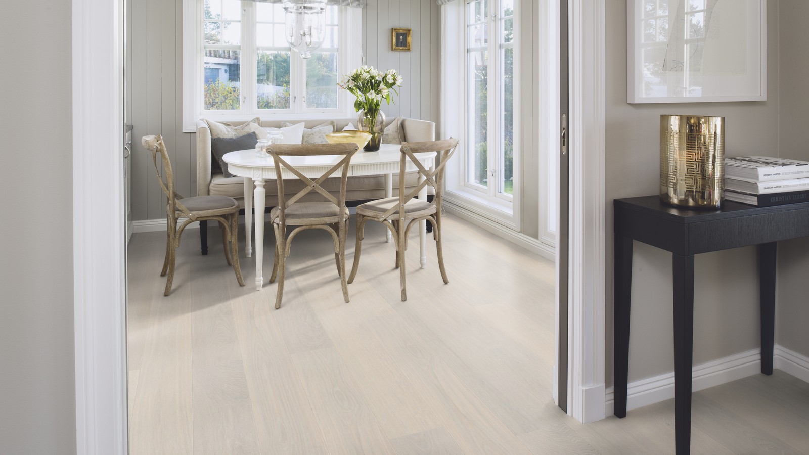 Однополосная паркетная доска дуб белый Andante 209 браш, фаска, покрытие Live Pure. Благодаря специальной обработке напольного покрытия, Live Pure представляет собой поверхностный слой, который защищает пол от пыли, грязи, жидкостей и химических веществ, хотя в то же время пол выглядит и ощущается как необработанная или отшлифованная сырая древесина. Поверхность, обработанная Live Pure, также отличается лучшей устойчивостью к УФ лучам, чем стандартные покрытия из лака и масла. После укладки пола и во время его использования не требуется никакой дополнительный уход.